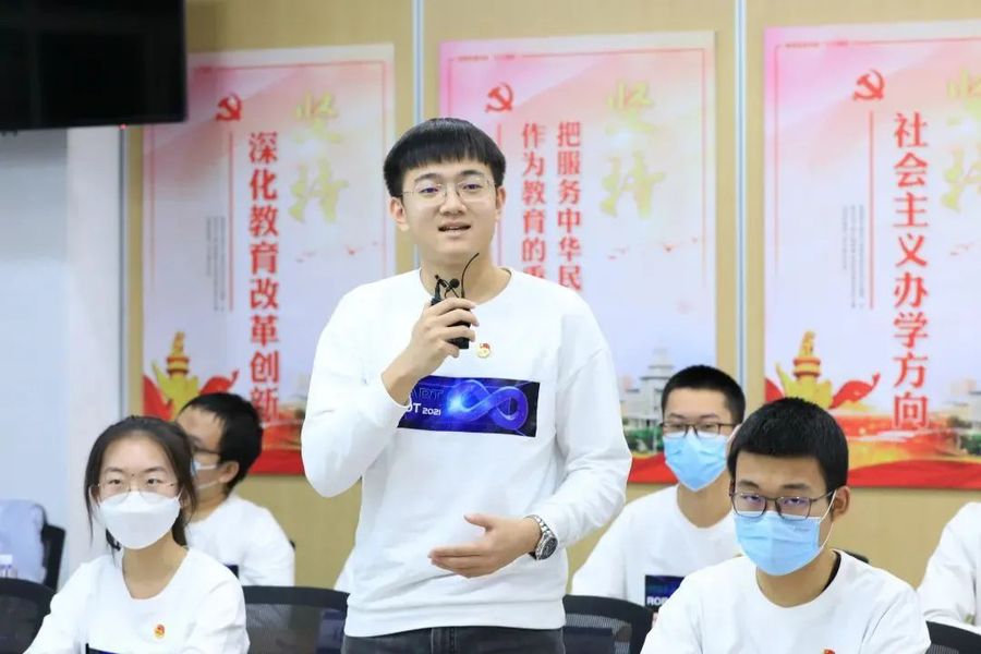 在学习贯彻习近平总书记在庆祝中国共产主义青年团成立100周年大会上的重要讲话精神座谈会上,我作为员工代表与公司党委书记熊四皓分享了我带领班级荣获“基础学部优秀学风班标兵”和我荣幸地成为2021级第一批入党积极分子的喜悦。如今,我在党员发展对象培训结业考试中,以第一名的成绩获评优秀学员,顺利成为2021级本科生第一批党员发展对象。